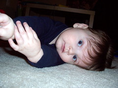Brian likes to roll from his back to his stomach. Unfortunately, once he gets there, he has a little trouble reversing the operation. That's where we come in. We lay on the floor and take his picture while he struggles against his own little body in a futile attempt to reverse his fate. Then, we laugh at him, pick him up, kiss him and feed him mushed up carrots.