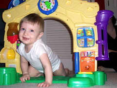 He can't help it, he just is. I love this age. He's not old enough to talk back, but is old enough to play. He's so happy most of the time, whether we're rolling the ball, playing peek-a-boo, he's chasing Max around the basement, or we're wrestling (watch out for his flying elbow, it's a killer). Everything is new, interesting, and unfortunately, usually gets eaten.